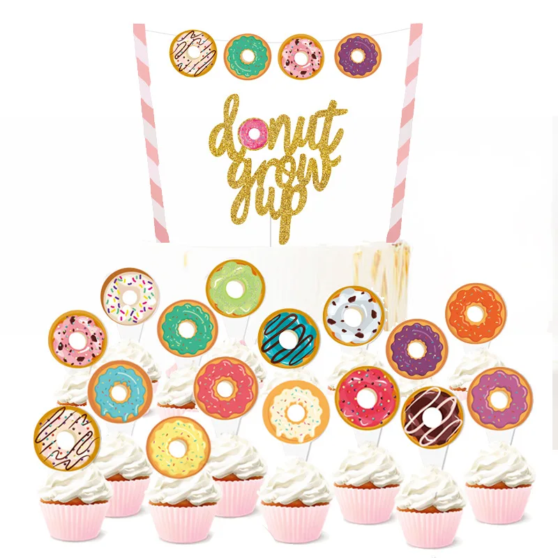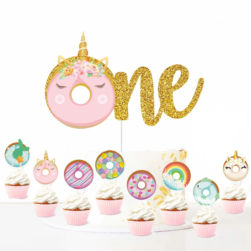 Paper Donut Grow UP Cake Toppers Glitter Gold Two Sweet Cupcake Topper Happy Birthday Pull Flower - Festive