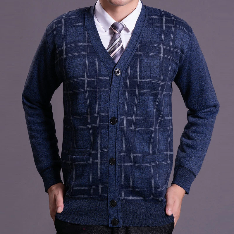 Men Autumn Winter Knitted Cardigans Mature Casual Plaid Blue Gray V neck Warm Fleece Liner Sweaters - Sweaters